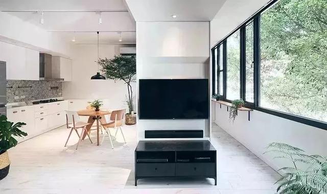 電視背景墻只留下了電視寬的的空間,底部擺放黑色的電視柜,整個(gè)開放式空間內(nèi)有著大量的綠植,搭配大白墻,顯得簡約而又自然。