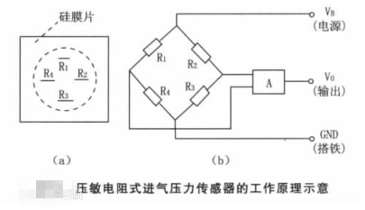 進氣壓力傳感器種類較多,有壓敏電阻式、電容式等。由于壓敏電阻式具有響應時間快、檢測精度高、尺寸小且安裝靈活等優點,因而被廣泛用于D型噴射系統中。