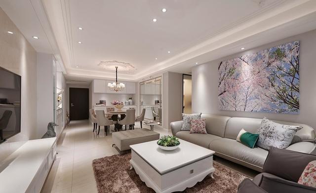 首先我們來看看客廳整體的裝飾,客廳里面的空間比較大,同時在色調(diào)的布置上,就能夠一眼讓人覺得視野很開闊,簡潔自然,雖然是簡歐的裝飾風(fēng)格,但是整體還是添加了更多的現(xiàn)代裝飾元素,讓整體裝飾更貼合現(xiàn)代人的審美觀點。