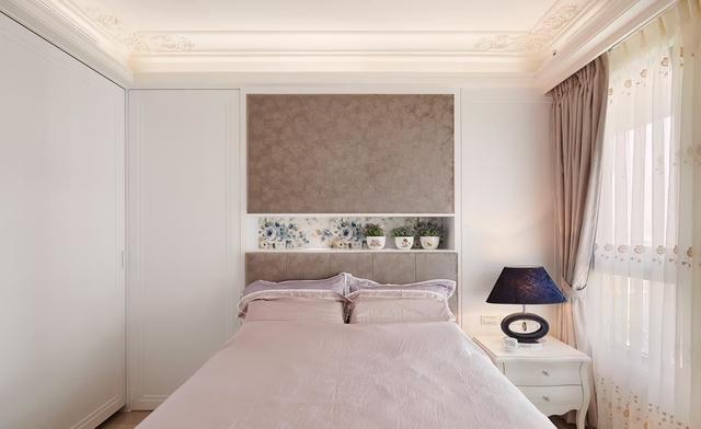 另外旁邊也有精美的臺燈布置,窗簾也是使用的雙層窗簾設(shè)計,白天的時候可以使用輕薄的紗簾,很有唯美的感覺。