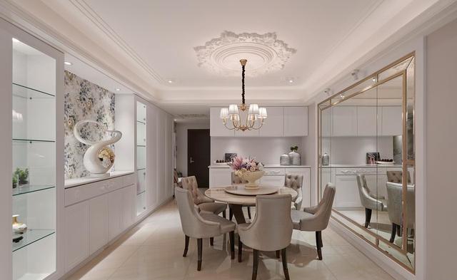 這里是餐廳的空間了,吊頂上面設(shè)計的是不是很不錯呢?另外,餐廳結(jié)合了鏡面的設(shè)計,同時也做了很多的收納儲物設(shè)計,讓餐廳空間感覺不那么小,這樣的設(shè)計,視覺感會更好一些。