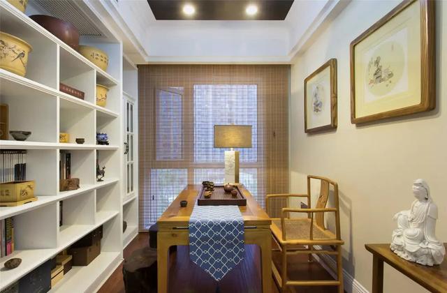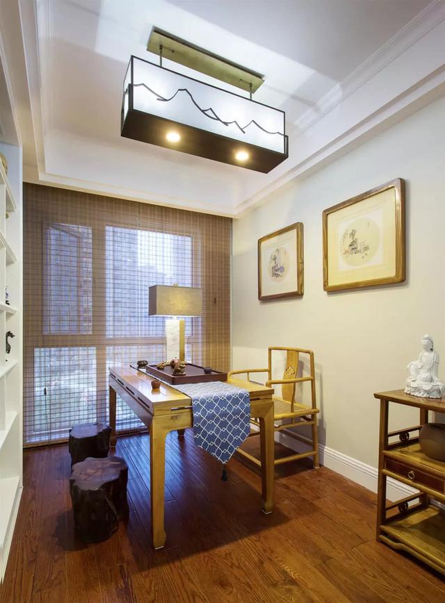 專屬于男主人的休閑茶室,一側設計開放式柜體,收納展示了男主人多年收集的各式茶具及書籍。以連綿山巒圖形的銅制燈藝輕柔照亮靜謐空間,綿密天然竹簾讓柔和的自然光線透射進來,營造出一種休閑雅致的氛圍。