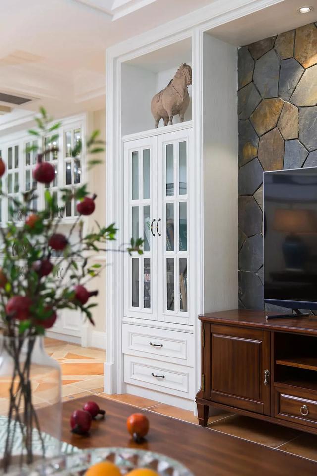 電視墻將原有墻體拆除,設計了大面積嵌入式儲物邊柜,以清玻柜門展示男主人珍藏美酒。