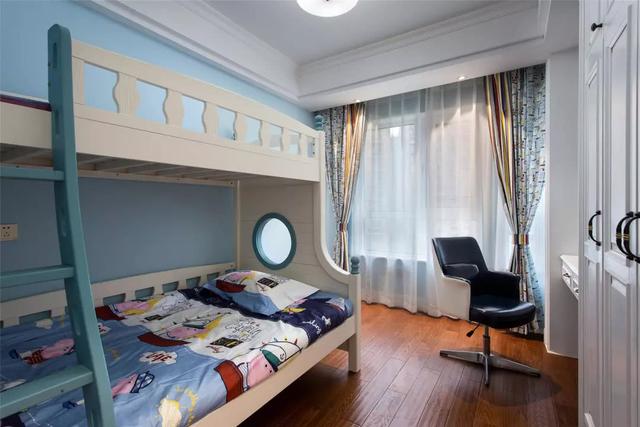 兒童房,選用清爽天藍墻面,搭配海洋主題家具及窗簾床品,自然流露出男孩子氣的童稚與天真。