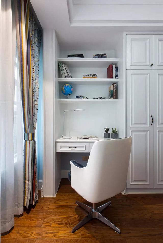 于靠窗采光良好處設置開放式層板的一體書桌,美觀實用。