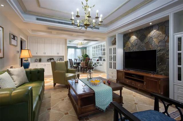 客廳,做了吊頂,以白色雙層木質頂線與銅制燭形頂燈的淺金色質感精致裝飾頂面。