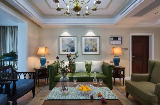 沙發墻正面,藍色布面單椅搭配暗綠色皮質沙發主位,沙發墻面以淺藍抽象裝飾畫作裝飾,兩側擺放青瓷對燈,令色彩在整個空間輕柔暈染、優雅靈動。
