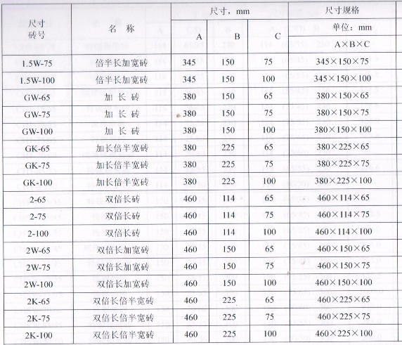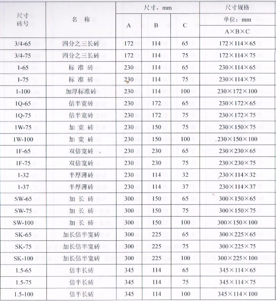 1、直形耐火磚尺寸規(guī)格(單位為毫米,mm)以A×B×C表示。