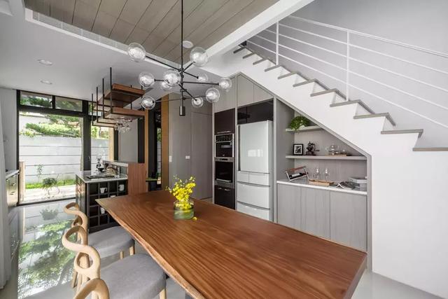 ▲樓梯下的雞肋角落,打造成餐邊柜,還可以塞下一個大塊頭的冰箱,超級完美。