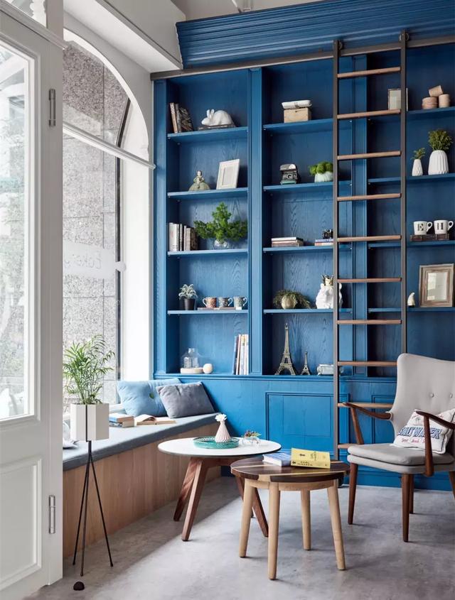 ▲靠窗打造一個飄窗,靠墻一側設計一面置物書架,刷著最潮的色彩,讓人為之眼前一亮。還可以擺上茶幾和椅子,或坐或躺,隨心而動。