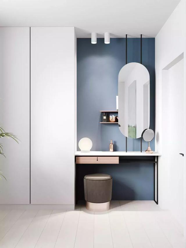 ▲將原本屬于衣柜的空間,騰挪出來打造一個小小的梳妝臺,滿足你家女主的愛美之心,也是一件美事。刷上美美得的墻漆,在空間中脫穎而出。