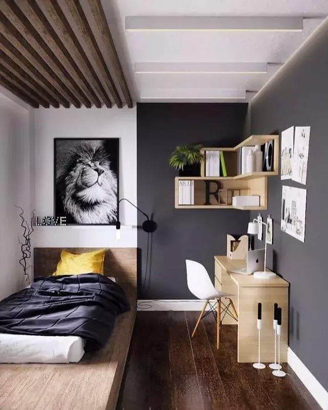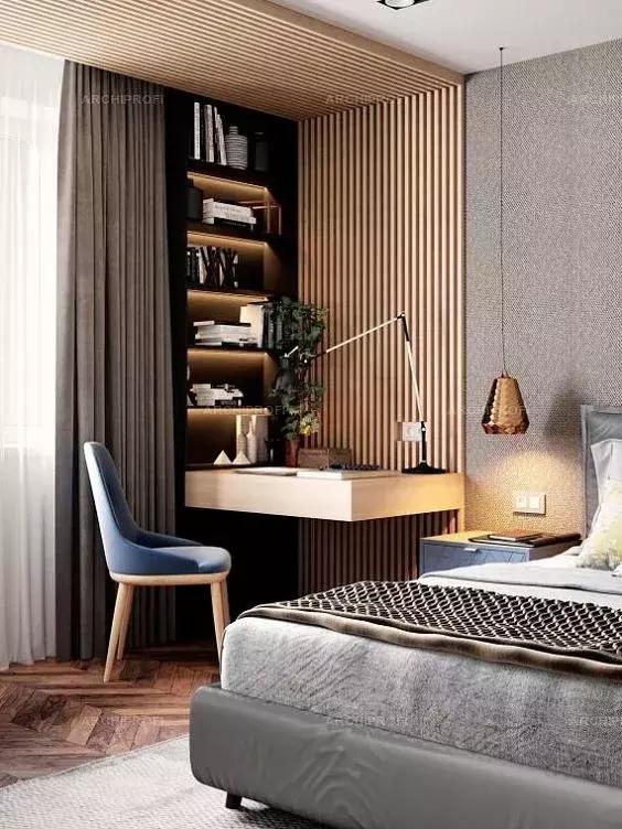 ▲嫌成品桌太占地方?那就在墻上嵌入一個書桌出來,旁邊還有配套的書柜,是不是很完美?最好看的還是那木格柵的吊頂與背景墻,讓整個臥室空間都變得溫潤自然起來。