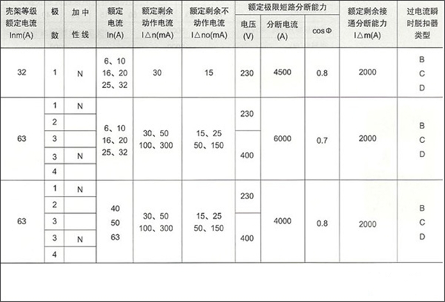 漏電保護開關的型號一般有額定頻率為50HZ的220V和380V兩種,其中220V開關有家用漏電,單極帶漏電,兩極帶漏電,如果是工廠就需要用380V了。斷路器與其所保護的線路之間要配套:家庭用一般分為15A,20A,32A,40A。市場上的漏電保護開關有DZL18-20、DZL31、DZL43、FIN 、K、E4FL、F360系列。