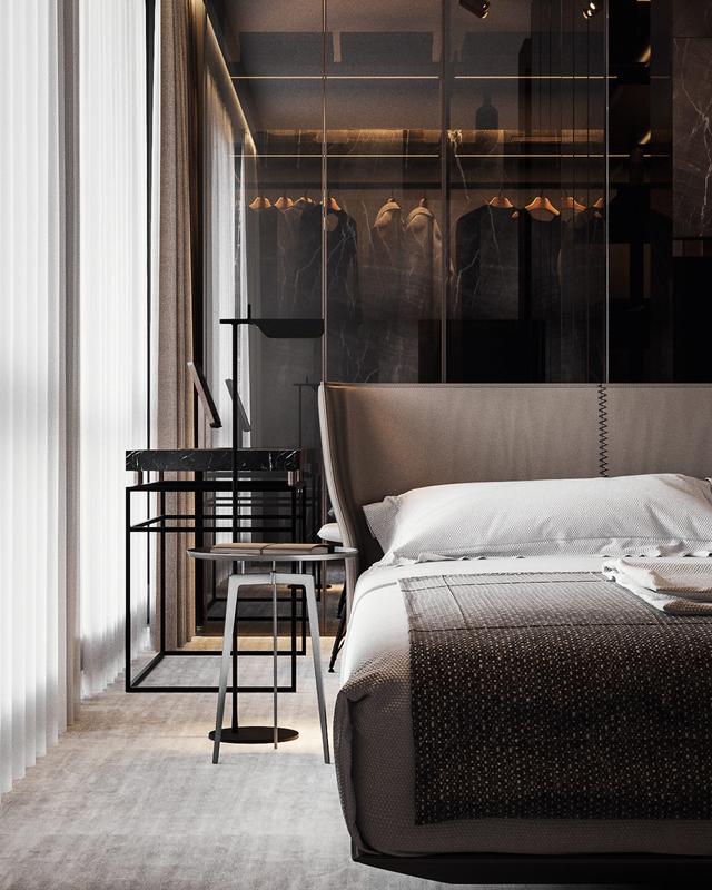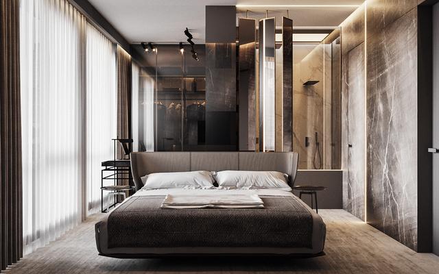 主臥由帶翼的平臺床床頭板分隔;更衣室在它的左邊,右邊是一個套間浴室。