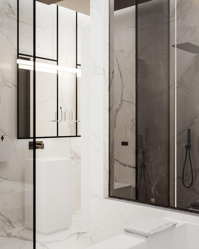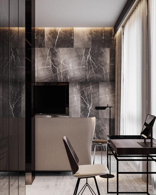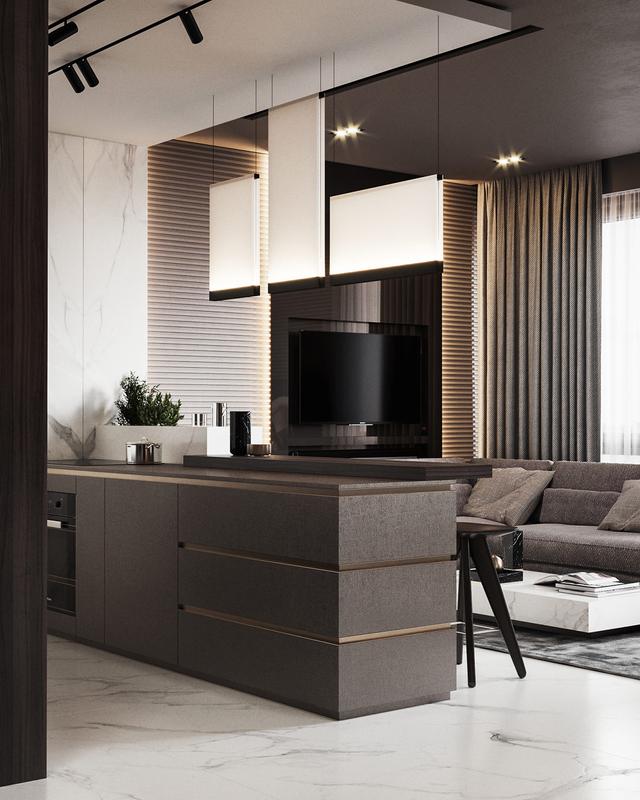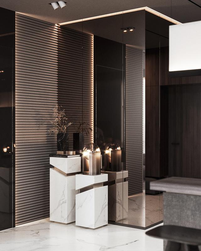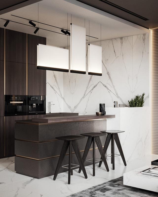 在廚房的盡頭有一面與書籍相配的大理石特色墻,這是一種奢侈而又容易清洗的選擇。休息區相鄰的面板采用肋狀設計,柔和的燈光使其更加突出。