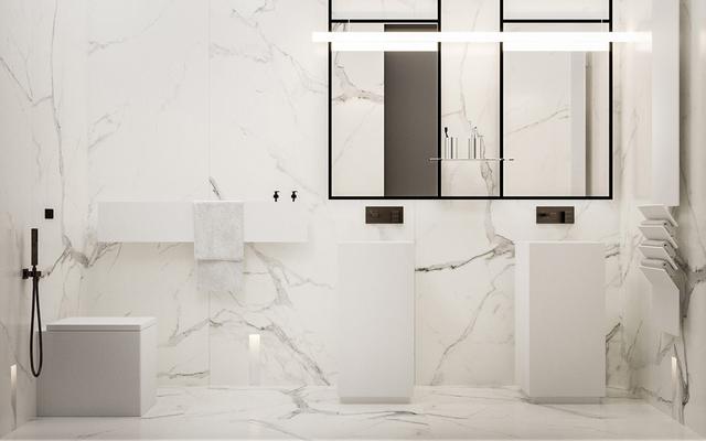 衛生間、浴缸和基座盆有一個尖銳的長方體輪廓。