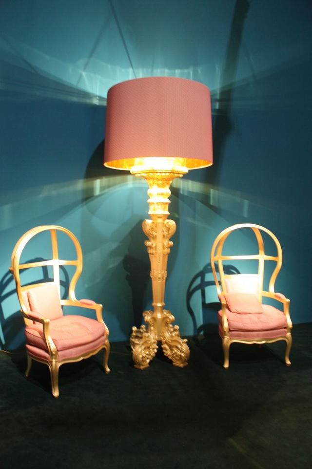 粉彩在正確的設計中也可以是異想天開的。通過重復和大膽的造型,也可以增強柔和家具的影響。Boffi的這兩把椅子采用柔和的鮭魚色裝飾,但豐富的金色和寶座般的形狀使它們更具戲劇性。此外,燈的巨大尺寸使其異想天開,燈罩的顏色更加明顯。