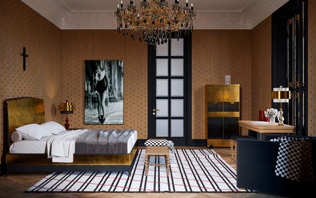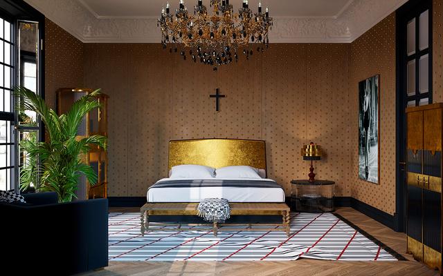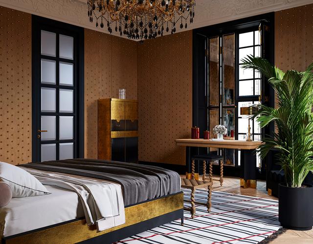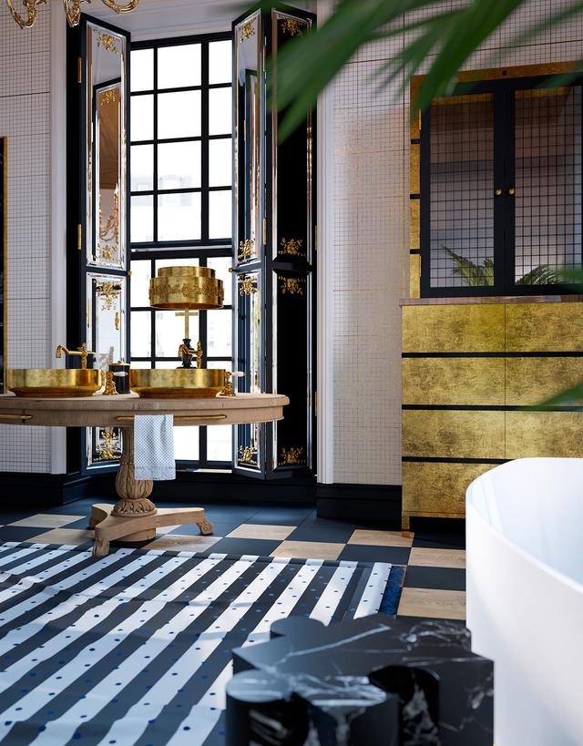 金色裝飾的豐富光澤觸及了這個住宅裝修設計的每一個角落。從閃閃發光的金色長椅和帝王扶手椅,到獨特的儲物柜和書架。耀眼的金屬主題甚至可以轉化為門鉸鏈、家具把手、小裝飾品和特別挑選的家居配飾的細微細節。在這個不同尋常的家居空間中,你會發現很多金色奢華的感覺,包括金色的客廳,金色的廚房,奢華的金色臥室,豪華的浴室,里面有一組引人注目的金色臉盆和配套的水龍頭。