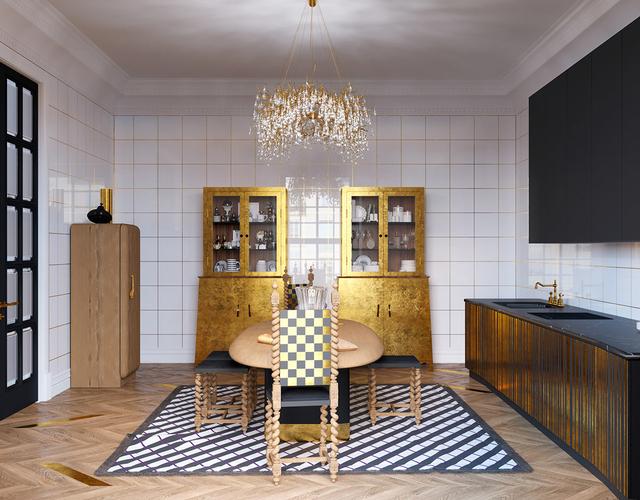 看起來適合國王和王后的餐椅放在廚房一張長餐桌的頭和腳上。餐桌上的金色餐椅占據了其余的空間,桌腿浸在金色里。一盞金色的枝形吊燈裝飾著餐廳。黑色的廚柜提供了一個黑暗的背景,使金色和水晶燈可以真正發光。