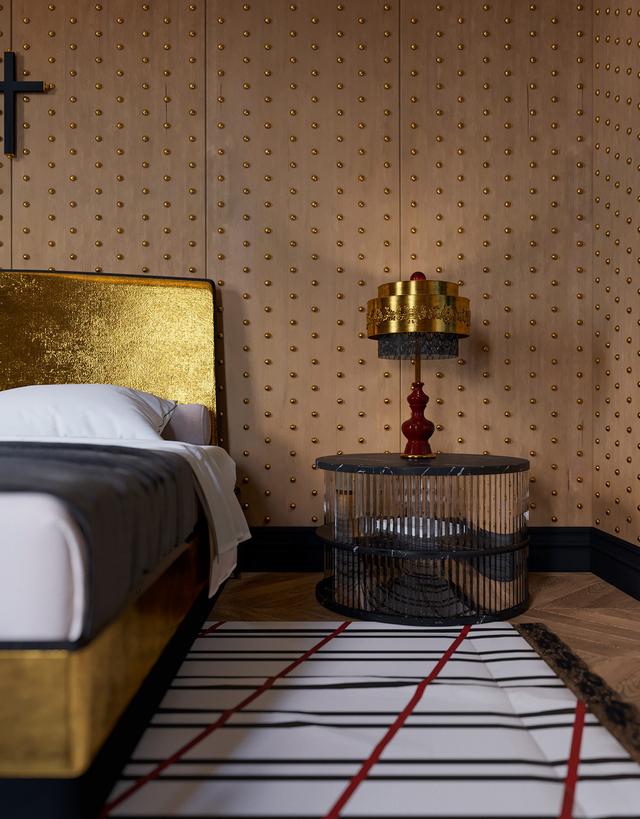 黑色和紅色的條紋穿過床下的一塊大地毯,將睡眠空間與梳妝臺和臥室椅子連接起來。