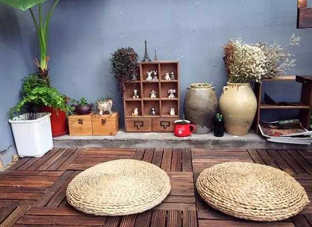 院子里最大的工程可能是地板的拼接了,11元一塊,共花了600多。但卻讓孩子能夠與水泥地面隔離,放上兩個蒲團,一個喝茶區輕松營造出來。