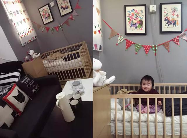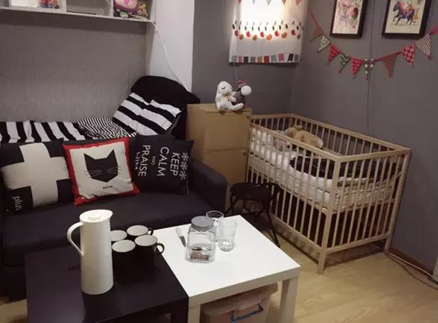 改造后的房子卻變成了客廳與嬰兒房的結合,舊時放電腦桌的柜子已經被挪走,替換成了孩子的嬰兒床,變成了小寶貝的地盤。