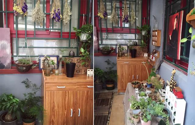 側面的墻上加上了很多置物架,零零散散的小物件都有了歸屬地。而花花草草們也讓院子變得更加欣欣向榮,再配上男主人年輕時畫的油畫,讓人印象深刻。