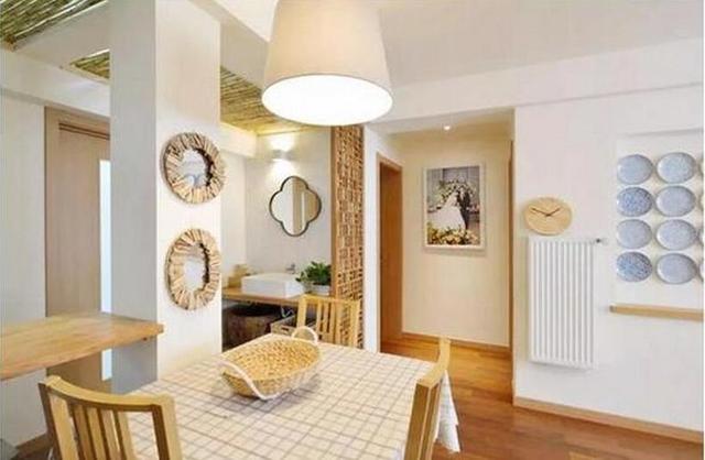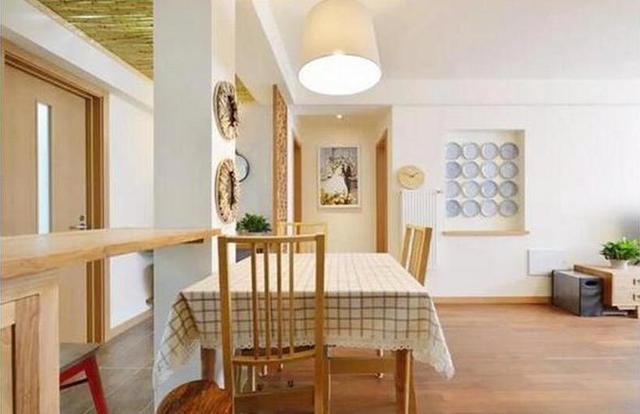 餐廳里的原木餐桌上鋪設了白色方格桌布,搭配藤編籃,在暖黃色燈光的照射下,散發著純樸溫馨的氣息。