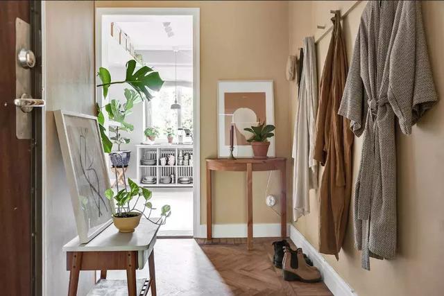 入戶的玄關走廊比較窄,而且也有獨立的儲物間,所以只是擺放了端景臺、換鞋凳,墻面做了掛鉤,用來更換平時穿的鞋子、掛下大衣非常方便。