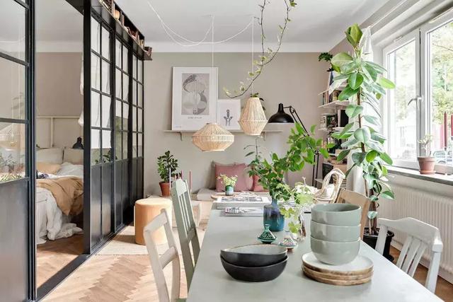 臥室和客廳之間用黑色的玻璃推拉門作為隔斷,精致的小床搭配柔軟舒適的床品,再加上綠植作為點綴,清新而又自然,睡眠也會有個好心情。