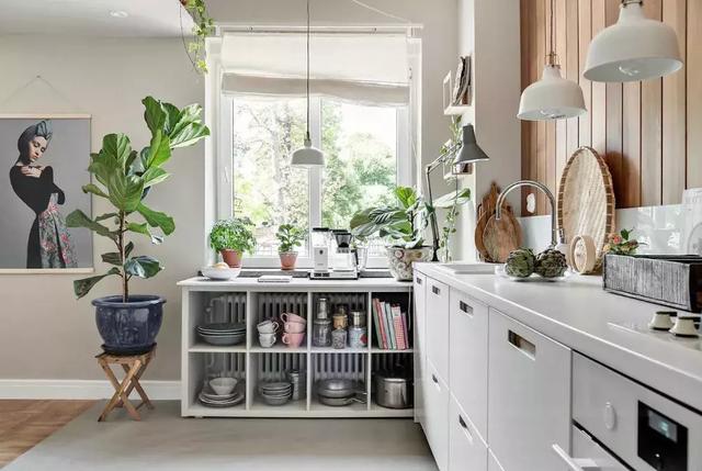 走過玄關走廊就到了開放式的廚房空間,一字型的櫥柜布局,電器大部分都嵌入了櫥柜內,靠窗的地方擺放一個置物架,加上綠植之后更顯清新。