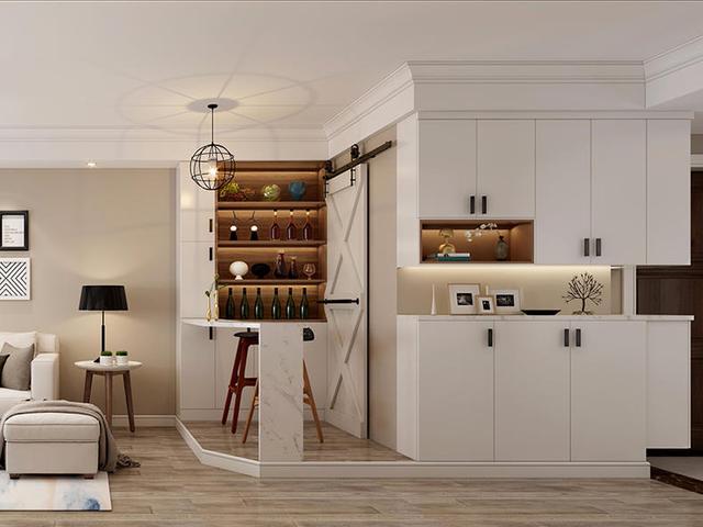 在客廳的一角還裝飾了一個(gè)精美的酒吧設(shè)計(jì),這種一體化的設(shè)計(jì)顯得非常精致,酒柜采用原木色的格調(diào),與周圍白色的格調(diào)形成了鮮明的對(duì)比,隔板上整齊的擺放了很多的酒具和紅酒,在燈光的映襯下,顯得非常高貴奢華。