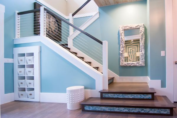 樓梯的安全性是非常需要注意的,國內樓梯上護欄應保持在85左右,二樓圍欄高度應保持在90-100cm,小柱之間的間距應在12-15cm,有小孩的家庭樓梯較好有立板,以防小孩滑落,木質踏板應有防滑槽,涂裝應使用環保高檔油漆,為使樓梯固定平穩應在靠墻的地方選擇支點使用臂托。
