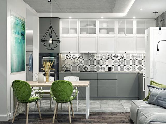 打造了一個開放式的廚房,廚房這樣裝修顯得非常時尚,同時也極大地拓寬了餐客廳的面積,高級灰色的櫥柜呈L型沿墻擺放,搭配一組白色的吊柜,將廚房的空間非常好的使用了起來,能夠提供非常好的儲物收納能力。