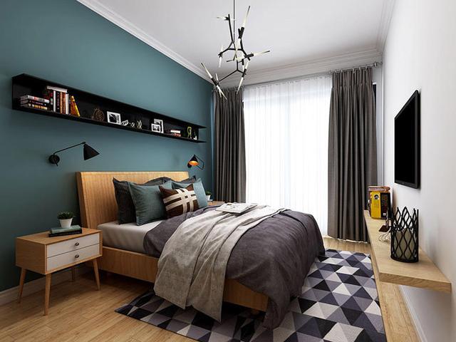 次臥面積小,但是改造的非常精致,床頭背景墻上采用藏青色的格調,搭配淺色的實木地板,大大提升了臥室的舒適度,大床下面還有幾何圖案的地毯裝飾,使得臥室顯得更加時尚一些,為了讓臥室看上去更加時尚有立體感,還在床頭背景墻上裝飾了一個深色的書架,可以擺放一些書籍作為裝飾,增加臥室的文藝范。
