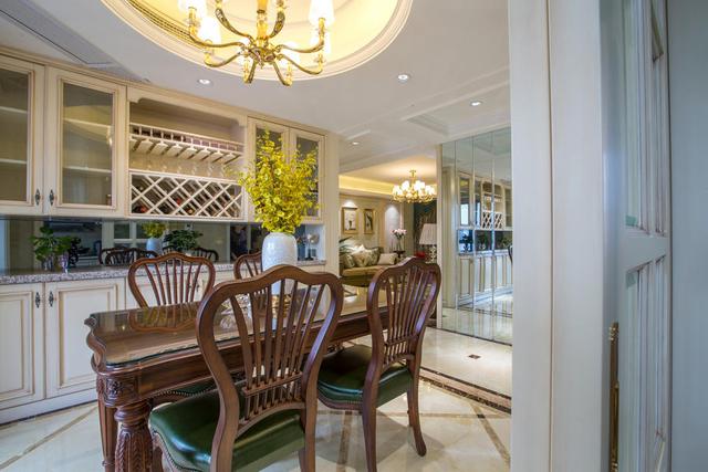 紅桃木的餐桌椅,特別的上檔次,還好老婆沒有買現代的那種餐桌椅,這個看起來更加有檔次多了,旁邊的餐邊柜加酒柜也是非常的棒,全屋都不怕沒有儲物空間,到處都能儲物,不得不說,這個房屋裝得太棒了。
