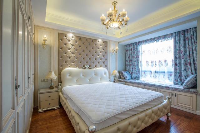 主臥的裝扮也是非常的優雅溫馨,飄窗做成了卡座休閑區,美觀還實用,床頭的背景墻用的是軟包的設計,大氣,旁邊還有一整面的嵌入式的衣柜,超強大的儲物空間