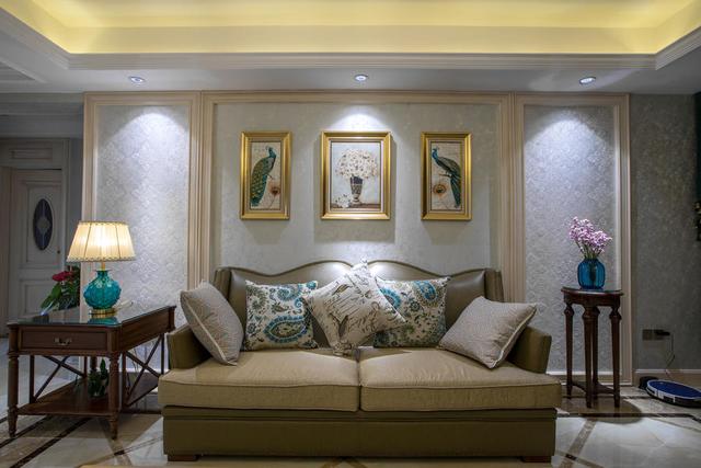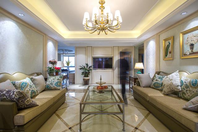 不得不夸一下這個沙發背景墻,我們的客廳裝修是跟別人不一樣的,電視柜放在了走廊上的墻壁上,客廳的兩面都裝了沙發,雙排沙發,顯得非常的寬敞舒適,這點設計,非常的好,沙發背景墻用的是銀色的壁紙,加上金邊的設計,顯得非常的高貴,客廳還做了暖色系的吊頂,放置燈光帶,效果很是溫馨,一盞水晶吊燈,也是非常的高貴