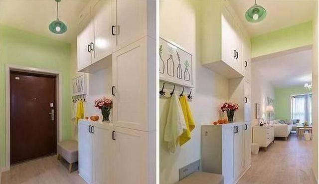 進門的玄關沒有做吊頂,這里打了上下組合柜,儲物空間十分充足。門口處擺放了一個換鞋凳,上面還設置了衣帽鉤,用來掛置衣物。