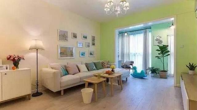 客廳里的沙發墻以及電視墻都沒有做造型的設計,外面連著的陽臺也與室內打通,并設置成了工作學習區。外面的墻面也涂刷成了果綠色,搭配木地板,整個空間都充滿著清新的大自然氣息。