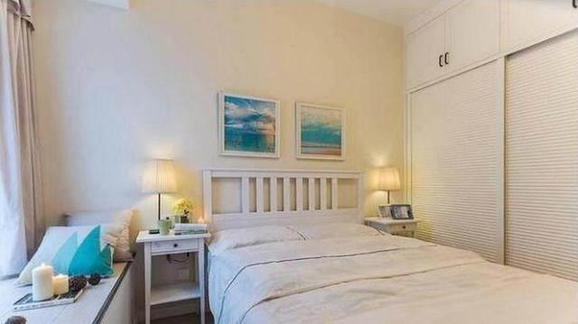 臥室里的墻面涂刷成了米色調,飄窗上鋪設了軟墊,打造成一個休閑區,增加了空間里的閑適感。床鋪一側的大衣柜做了到頂的設計,儲物功能強大。