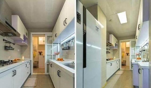 廚房位于進門的右手邊,這里采用了雙排一字型的櫥柜布局,中間留出了充足的過道空間。白色櫥柜搭配米色墻磚、地磚,看上去非常簡潔大方。