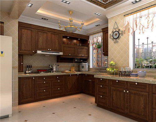 棕色的柜面色系給人一種歲月感,再加上復古的掛鐘,將原野的印象感凸顯得淋淋盡致,木質色調看著十分沉穩潤澤,而地柜的設計增加了不少的儲物空間,油煙機的隱藏使得美觀性更為強烈,相信歷經歲月的人士必定極愛這副裝扮。