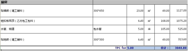 廚房總預算為3040元