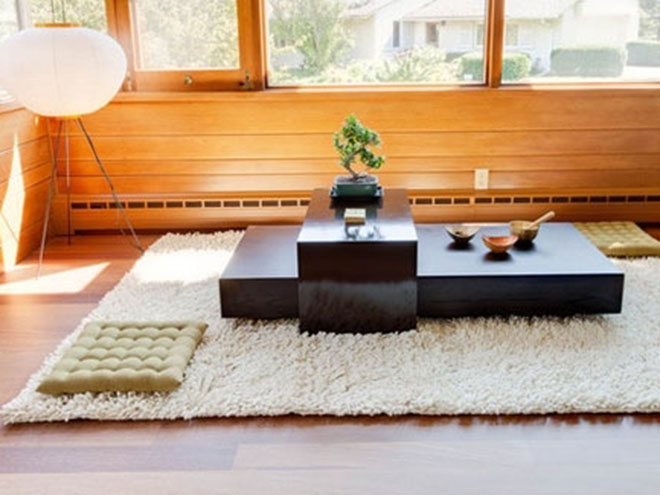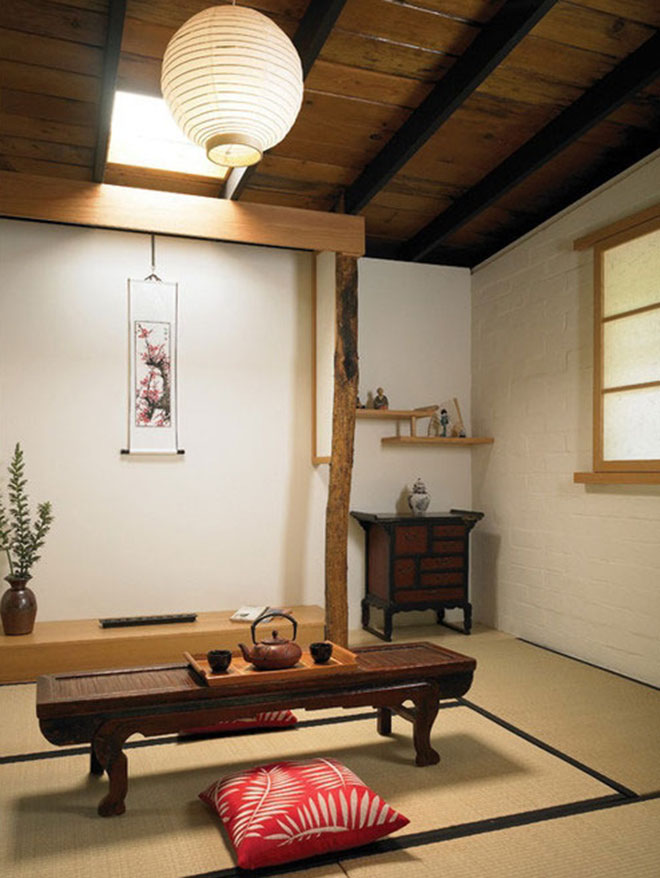 作為日式榻榻米風格的茶室,這一間茶室選擇了黑+白+木色這種典型的日式風配色。在空明的房間里,低矮的日式原木茶幾、鋪滿整個房間地面的素雅席墊、起到提亮作用的舒適紅色坐墊,再加上墻邊懸掛的書畫、頗具日式風韻的白色紙燈,簡簡單單就打造出了一個簡潔大方的和風小茶室。