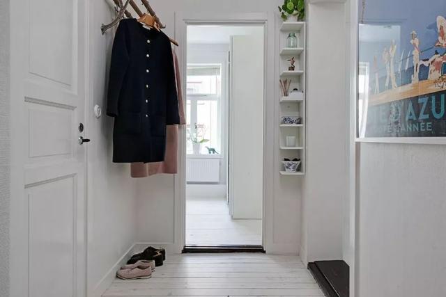 玄關(guān)比較窄,不適合打那種衣服鞋柜一體式的組合柜,所以就給裝了這么一個衣帽架,鞋子直接擺放在角落里,對面的墻角內(nèi)還特意掛了個角柜,擺放飾品或放鑰匙。