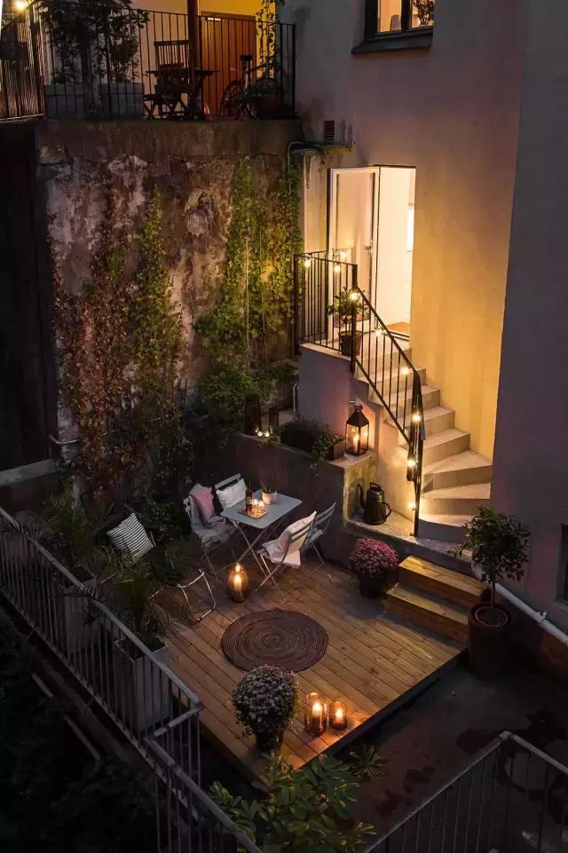 此外,還有一種也是搞氣氛的絕佳高手,那就是臺階燈帶設置,它在提供輔助光源,方便我們行走的同時,又可以增加視覺上的層次感,為露臺增添了別樣的風情與基調。