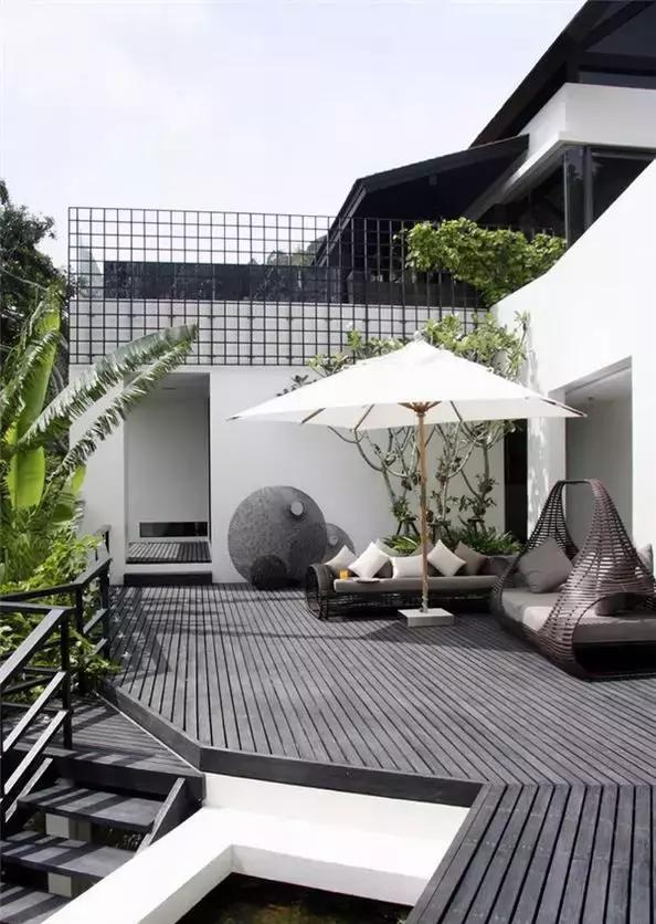 防腐木護欄+攀緣類綠色植物,不僅可以通過圍合式手法制造出私密空間,而且也將整個露臺設計變成了室內空間的戶外延伸,看上去毫無違和感。