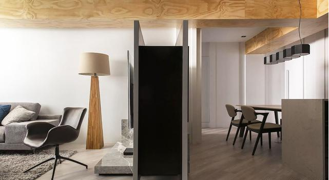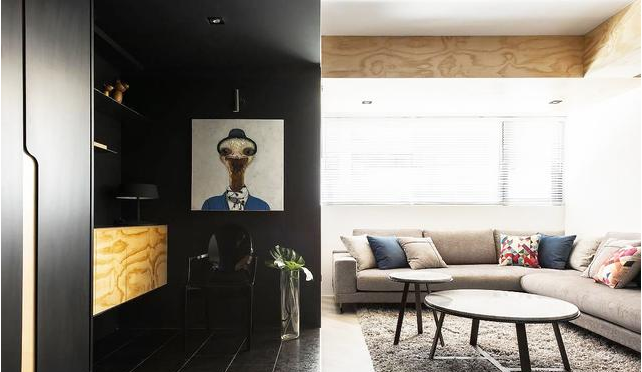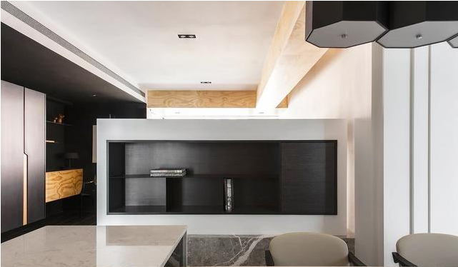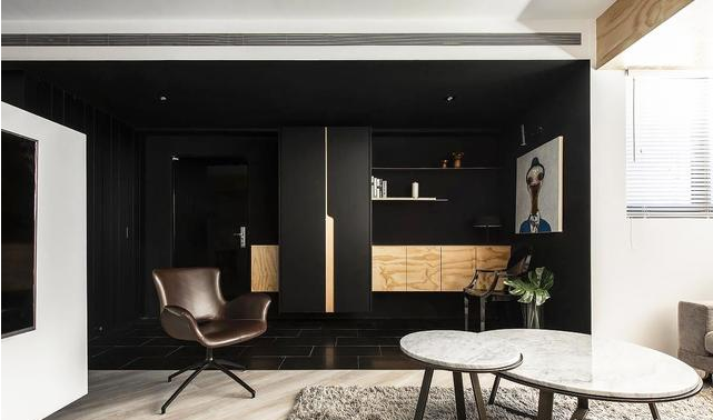 老時(shí)代的房子裝修設(shè)計(jì),不僅梁低,而就算格局方正,但門(mén)開(kāi)在正中央,也少了玄關(guān)感,客廳深度也不夠。于是,在納入玄關(guān)需求的同時(shí),又不至于碎化空間的線條,巧妙將客廳方位轉(zhuǎn)向,再借異材質(zhì)和色差分界場(chǎng)域,形成黑白對(duì)比的風(fēng)格語(yǔ)匯。