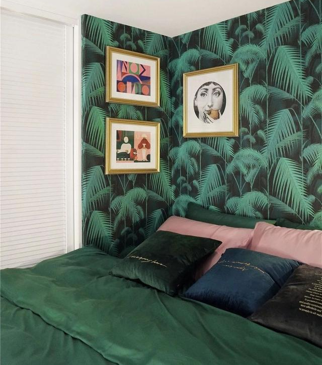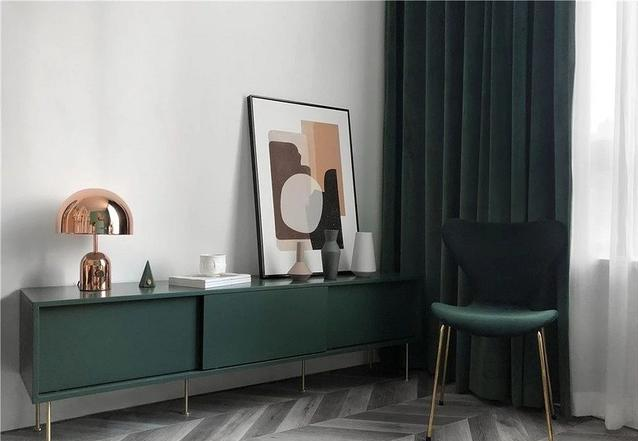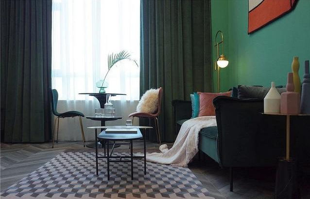 客廳更加大膽的運用起各種深淺不一的綠色,通過小塊黃銅元素家具和不同顏色的抱枕掛毯來協(xié)調(diào),讓整個綠色空間更富有層次感。